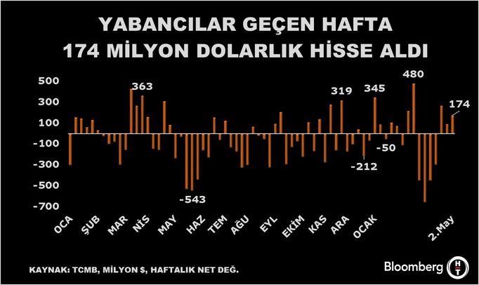 Türkiye Cumhuriyet Merkez Bankası (TCMB) tarafından açıklanan datalara nazaran, yurt dışında yerleşik şahıslar piyasa fiyatı ve kur hareketlerinden arındırılmış datalarla 2 Mayıs haftasında 173,6 milyon milyon dolar net pay alışı yaptı.