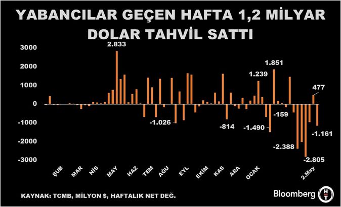Türkiye’de evvelki hafta, 10 hafta sonra satışa bir haftalık orta veren yabancı yatırımcı 1 milyar doları aşan tahvil sattı.